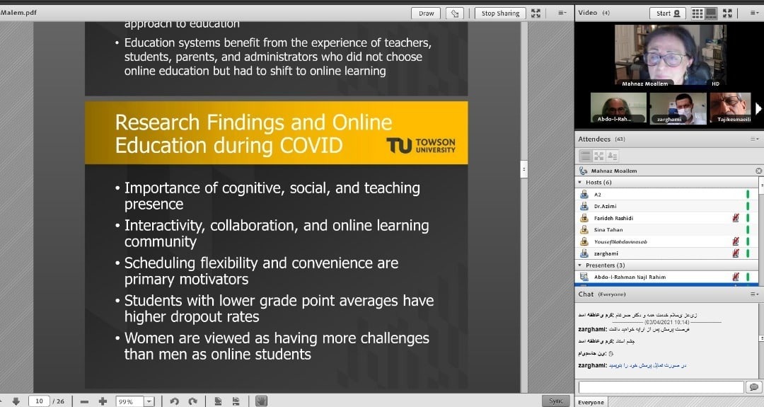 ایشان عنوان کردند: تحول ناخواسته ای که چابکسازی انجام امور دانشگاه ها را امکانپذیر ساخت و در عین حال پرسش های بسیاری را پیشروی آموزش عالی جهان قرار داد. پرسش هایی از جمله چگونگی تاثیر فضای مطلق مجازی بر نظام آموزش عالی، چیستی ویژگی های منحصر به فرد آموزش و یادگیری در فضای مجازی، چگونگی مطلوب سازی آموزش های الکترونیکی آنالین و آفالین، و چگونگی آموزش های اثربخش حرفه ای برای اعضای هیات علمی و کارکنان دانشگاه.