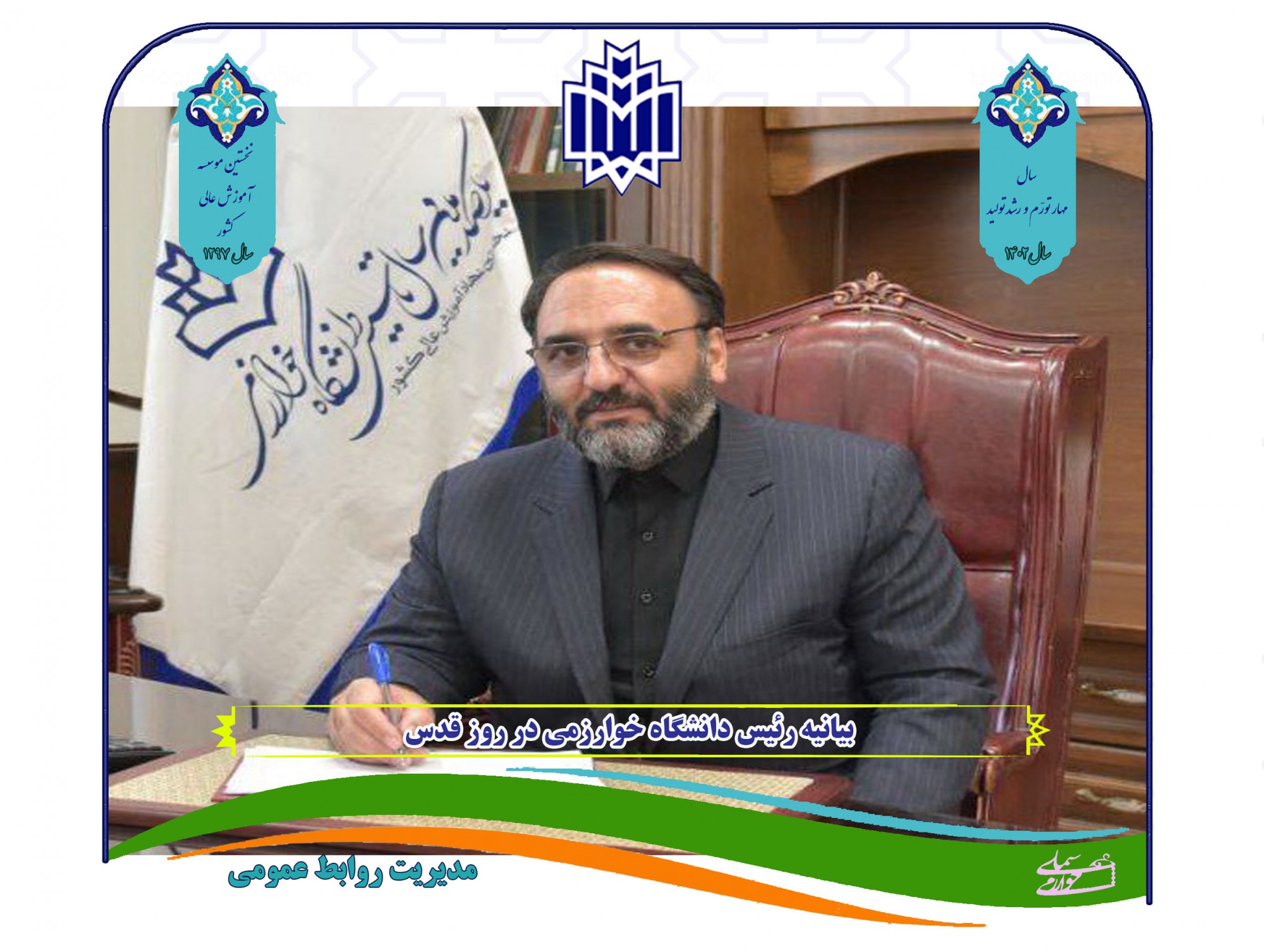 اینک دستان اسرائیل ظالم و آمریکای جنایتکار که بت شکن انقلاب آن را شیطان بزرگ نامیده است به خون انسان های فراوانی در جای جای دنیا آغشته است و این بی آبرویی تا آخرالزمان از چهرۀ به ظاهر حامی حقوق بشری آن ها پاک نخواهد شد. دانشگاهیان دانشگاه خوارزمی همراه با همۀ آزادیخواهان جهان ابراز نفرت خود را از جنایات دد منشانه ظالمین جهان اعلام داشته و اعتقاد دارد با خون شهیدان گلگون کفن و وعدۀ الهی جهان از آن مظلومین و مستضعفان است.