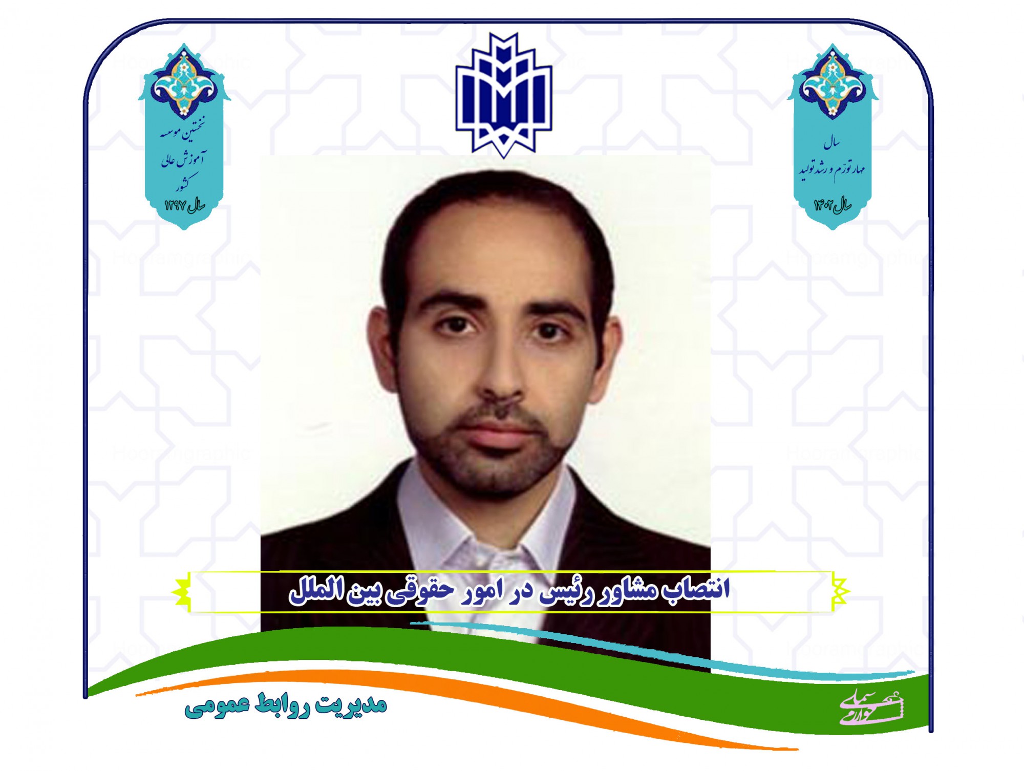 نظر به مراتب تعهد، تخصص و شایستگی و تجارت ارزنده بین المللی جنابعالی، به موجب این حکم به مدت دو سال به سمت «مشاور رئیس دانشگاه در امور حقوقی بین الملل» منصوب می­شوید. امید است با یاری خداوند متعال، همفکری همکاران و فرهیختگان دانشگاه و استفاده از ظرفیت های دانشکده­ها و اعضای هیئت علمی و هماهنگی  با مدیریت بین­الملل در جهت بسترسازی فعالیت­های جدید و توسعه برنامه های مشترک با دانشگاه های خارجی، موفق و موید باشید.