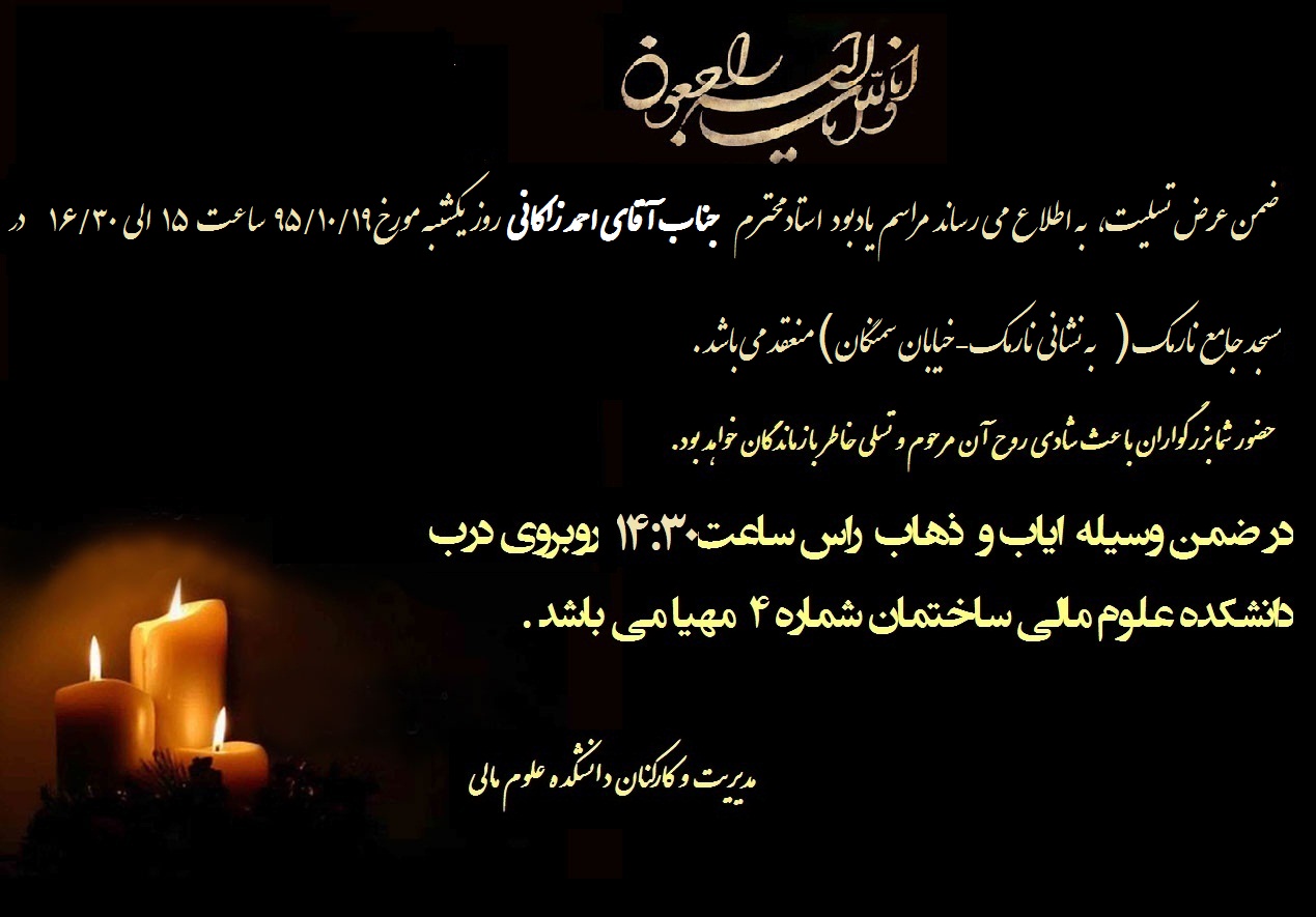 درگذشت جناب آقای احمدزاکانی عضو هیات علمی دانشکده ی علوم مالی(18/10/95)
