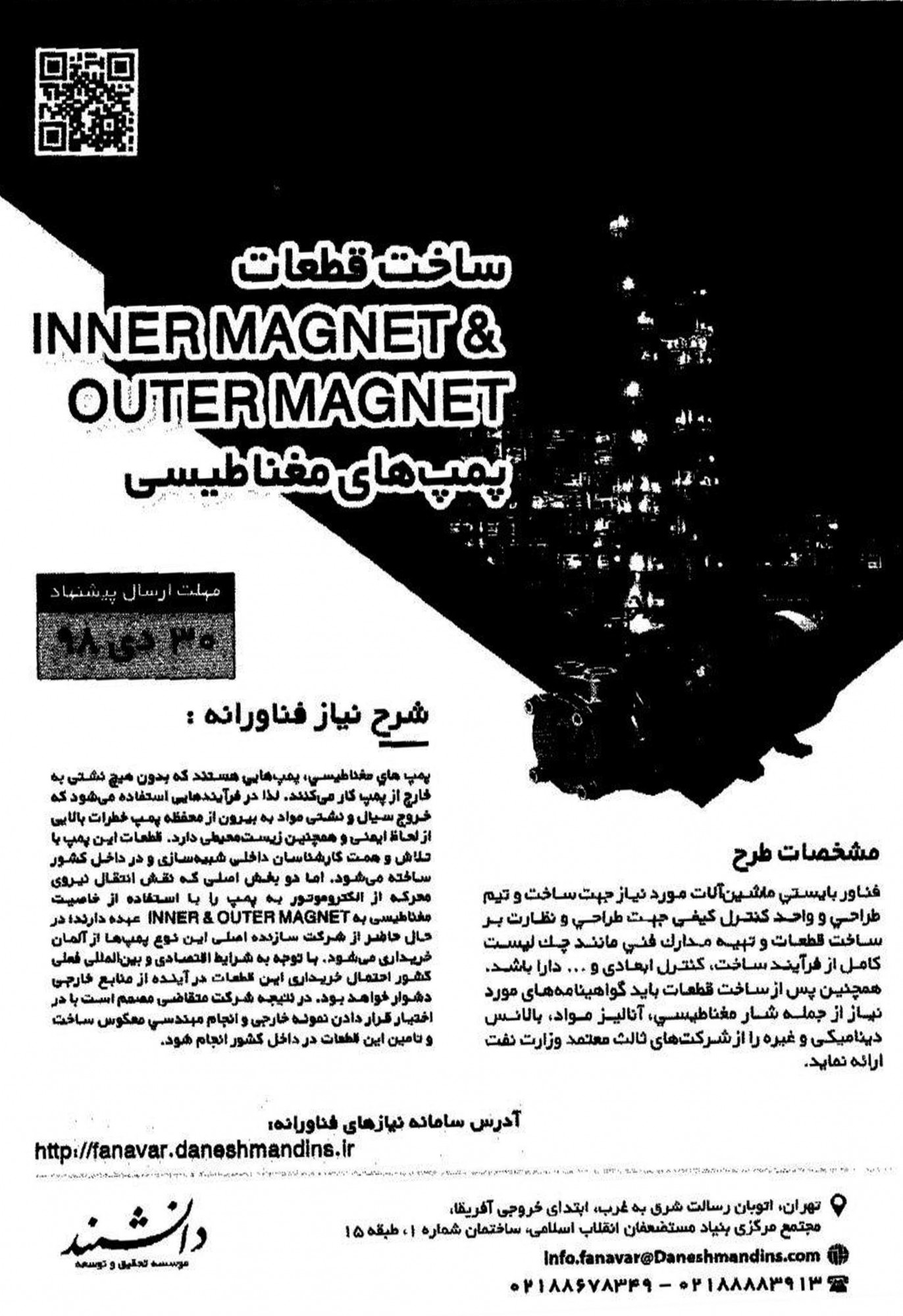 فراخوان دریافت ایده های فناورانه در حوزه ساخت قطعات پمپ های مغناطیسی فراخوان دریافت ایده های فناورانه در حوزه ساخت قطعات پمپ های مغناطیسی
